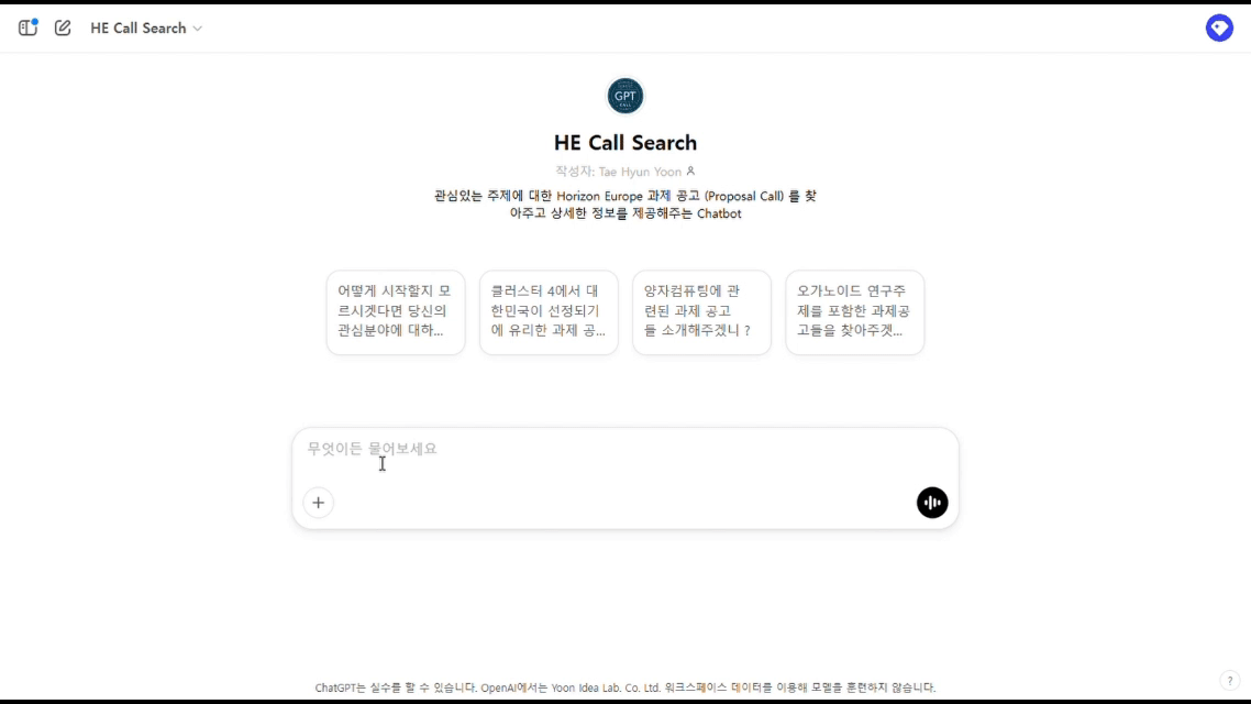 HE Call Search AI 는 윤아이디어랩(Yoon Idea Lab)에서 개발한 AI 기반 연구 공고 추천 시스템으로, 호라이즌 유럽 연구 공고를 탐색하고 연구자별 맞춤형 정보를 제공하는 역할을 합니다. 자신의 연구 관심 분야를 입력하면, AI가 적절한 공고를 필터링하고 핵심 정보를 정리해 제공합니다.