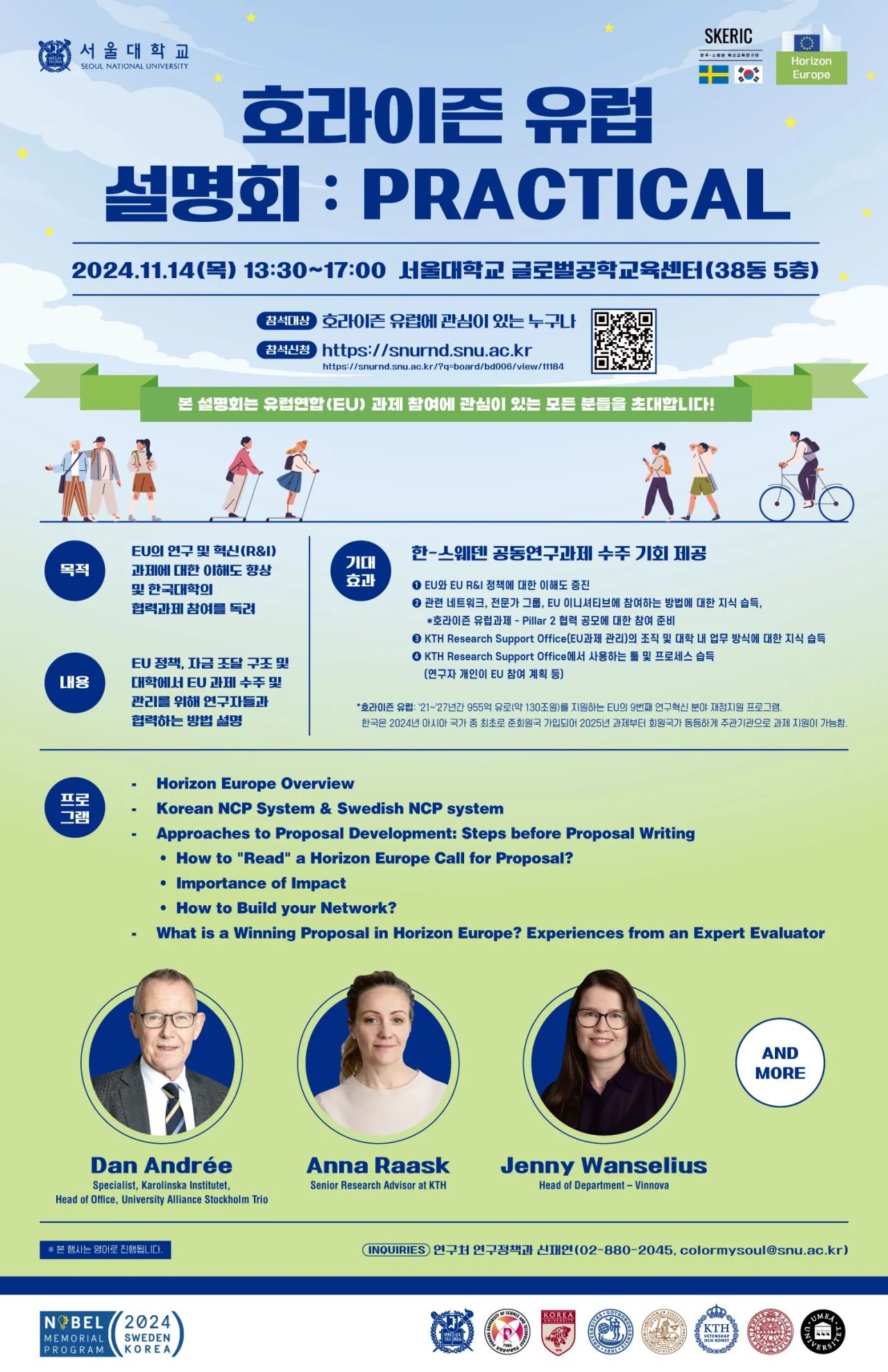 (주Yoon Idea Lab. )는 11월 14일 서울대학교에서 한-#SKERIC 교육, 연구, 혁신 협업 주간의 일환으로 KTH Royal Institute of Technology와 스웨덴 Karolinska Institutet가 주최하는 "Horizon Europe Info Session: Practical"에 초청되었습니다.