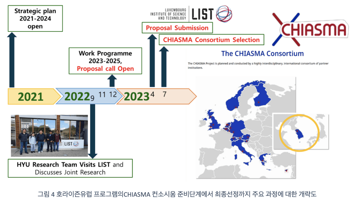CHIASMA 컨소시움의 코디네이터 기관인 LIST와 한양대학교는 H2020-MSCA-RISE 프로그램인 CompSafeNano 컨소시움에 함께 참여하고 있었으며, CompSafeNano공동연구의 일환으로2022년 9월 한양대학교 연구진이 LIST 를 방문하였을 때 각 기관의 연구 관심사 및 전문성의 상호 보완적인 내용들을 확인하고, LIST 의 Dr. Tommaso Serchi 가 준비중이던 CHIASMA 컨소시움에 한양대학교 윤태현 교수 연구진을 파트너로 초대하였음.