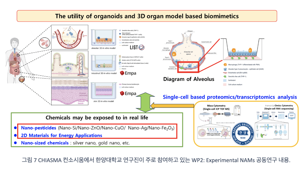한양대 연구진은 이러한 연구분야들중 특히 새로운 실험 모델기반 접근법 관련 “experimental NAMs” WP2에 참여하고 있으며 아래의 그림과 같이 첨단나노소재들에 노출된 다양한 오가노이드 및 3D 조직 모델들에 대한 단일세포 수준의 단백체/전사체 분석을 통한 데이터 생산을 목표로 공동동연구를 수행 하고 있음.