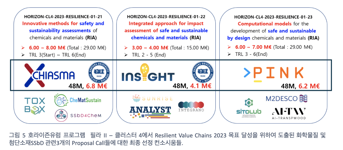 CHIASMA 컨소시움은 LIST 의 Tommaso Serchi 박사를 중심으로, 위의 3개 Proposal Call들중 HORIZON-CL4-2023-RESILIENCE-01-21 : Innovative methods for safety and sustainability assessments of chemicals and materials (RIA) 에 지원하기로 결정하고 각 분야의 역량있는 전문가들을 중심으로 컨소시움을 구성하였음.