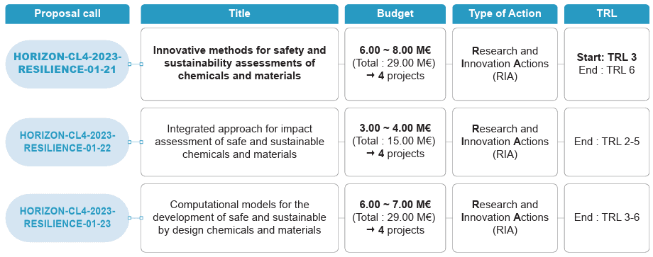 이러한 배경으로 필라 II - Cluster 4의 Destination #2 Resilient Value Chains 2023 달성을 위해 아래와 같이 설계단계에서부터 안전하고 지속가능한 신규화학물질 및 첨단소재를 개발하고자 하는(Safe and Sustainable by Design (SSbD) Chemicals and Materials) 3개의 Proposal Call들이 아래와 같이 공개되었음.