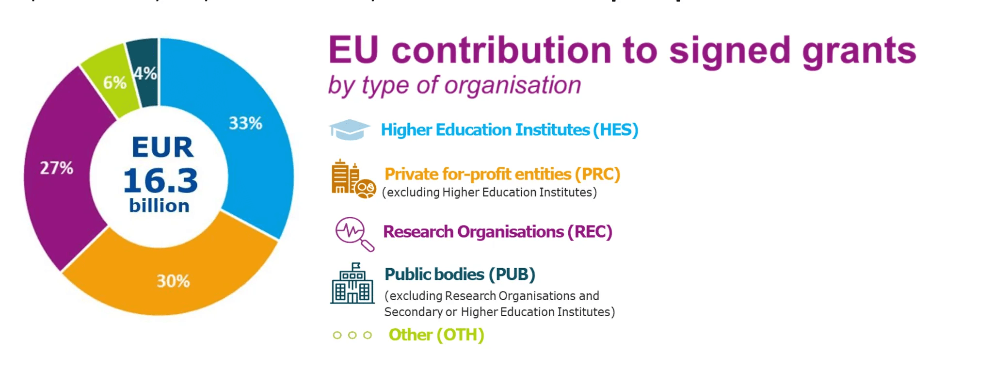 기관 유형별로 살펴보면 대학 등 고등교육기관이 53억 유로로 최대 수혜자가 되었고, 그 뒤를 사기업(49억 유로)과 연구기관(44억 유로)이 이었습니다. 특히 전체 참여 기관의 3분의 1 이상은 Horizon 2020에 참여하지 않았던 신규 참여기관으로, 이들이 Horizon Europe의 신선한 혁신 동력으로 작용하고 있습니다.
